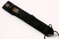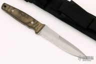 This Terzuola designed CQB1 fixed blade fighter by Camillus Knives has a bead blast finished drop/ spear point partially serrated blade with false top edge, full tang with jimping, and notched thumb ramp. 3/16" blade stock, 1-1/4" depth. Handle is green canvas micarta with lanyard hole and aluminum pins. Comes with a black nylon sheath. Has some light scuffs, otherwise excellent condition.