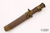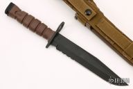 The Ontario Knife OKC3S Marine Bayonet is used and issued exclusively to the United States Marine Corps. This knife is unique in the fact that the blade is constructed using a thick proprietary blend of carbon steel. It has a non-reflective finish and ergonomically grooved Dynaflex handle to reduce hand fatigue. Situated in New York State's scenic Southern Tier, Ontario Knife Company produces one of the most comprehensive, wide-ranging product lines in the cutlery industry today. While being a worldwide supplier, the Ontario Knife Company is also a major supplier to the U.S. Government and its military. Ontario has built its reputation on a heritage of uncompromising craftsmanship, quality materials and components, and a steadfast commitment to its workforce A partially serrated blade with a 1.75 mission serration. Manufactured with a low noise signature polyester elastomer in the handle. Fitted internal stainless steel spring friction to secure bayonet. Includes a ceramic coated honing rod located on the back of the scabbard which is equipped with two load bearing attaching straps with cross straps. Includes glass filled nylon sheath. Has some light scuffs, otherwise excellent condition.