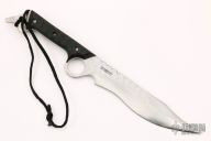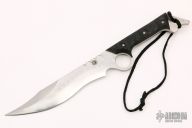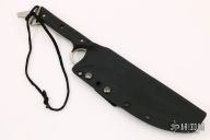 This Ringed Fighter by Richard Derespina features a hand rub satin finished blade with notched thumbrest and jeweled flats, .240" blade stock and 1.419" blade depth, full tang construction. The handle has black G-10 scales. Comes with a kydex sheath. Excellent condition.