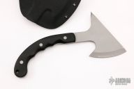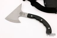Designed by Laci Szabo as a sound street axes produced by Larry Chew. Small but stout, this little axe can serve as a self-defense weapon as well as a survival-camp axe. It is concealable and light, making it the perfect choice for the city or the road. The Manhattaxe is small in size but not in performance. It can be used to cut fuselage or break a cockpit window, punch holes in cans of oil or even in steel drums. This small axe is especially popular with sea plane pilots who need to cut vines and weeds off the rudder. The Manhattaxe is entirely hand made and comes with a custom kydex sheath with a Blade Rigger Shoulder harness. Measures 4.25 inches across the face from spike point to blade edge; from upper blade tip to end of handle is 9.25 inches. Excellent condition.