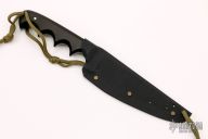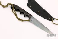 This Military Stiletto by Fred Perrin features a blued blade with notched thumbrest, .148" blade stock and 1.233" blade depth. The handle is comprised of black paper micarta scales with nickel silver pins over full tang construction. Includes kydex sheath. Has a few light scratches, otherwise excellent condition.
