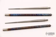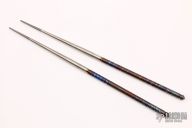 Feed yourself and your pride of ownership with these exquisitely crafted titanium chopsticks. Designed and engineered by world-renowned custom knifemaker Alan Folts and manufactured under the Foltsum™ brand, these chopsticks are beautifully crafted from solid 6AL 4V titanium stock. Their two-piece construction allows them to be conveniently carried when not in use, yet assembled in seconds thanks to a precision threaded joint. Machined in painstaking detail, they feature three different surface finishes, including a bead blasted area near the tip for a secure grip on food, a satin-finished center section, and a rich color-anodized handle section. Machined accents at the top and center add both a touch of style and a thoughtful grip texture that complements their perfect balance.Remarkably strong and lightweight, these elite eating utensils are also 100% corrosion resistant, completely food safe, hypoallergenic, and easily cleaned with ordinary soap and water. They come complete with a ballistic nylon carry pouch with dedicated pockets for all four pieces and a heavy-duty Velcro® closure.