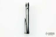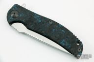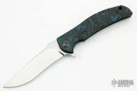 This Q-36 framelock flipper by RJ Martin features a tumble finished, recurve Magnacut (RC63) blade with notched thumbrest and a flipper. The handle has a black/blue Fat Carbon and blasted titanium frame and tip up clip, zirconium pivot and screws, and a Fat Carbon backspacer. Precision roller thrust bearings give the knife a very fast and smooth opening. Nice blade seating, detent and lockup. Comes with a zippered case. New condition.
