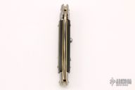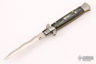 This 9" Swivel Bolster by Frank Beltrame features a polished Kris blade with false top edge. The handle has stainless steel bolsters, front and rear, horn scales, brass liners, stainless spring. Excellent condition.