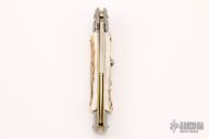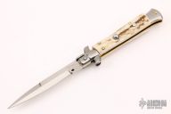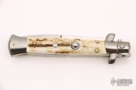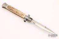 This 9" Picklock by Frank Beltrame features a polished bayonet blade with false top edge. The handle has stainless steel bolsters, front and rear, stag scales, brass liners, stainless spring. Excellent condition.