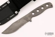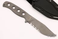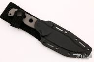"The MPS was designed as a flat and compact knife that was purposely designed to fit in the sheath on the United States Air Force, Navy, Marine Corps, and Army pilot survival vest. The blade is a smaller version of the MPK and the same versatile blade belly makes it a superior utility and survival model. The skeletonized handle allows this knife to fulfill requirements where ultimate lightweight and thin profiles are demanded. Regardless of whether you pilot an F/A-18 strike fighter from an aircraft carrier, a C130 aircraft for AFSOC or an Apache helicopter, this knife is always out of your way but always ready for immediate and intense use. Military and law enforcement personnel like the MPS because of its durability, lightweight and overall tough characteristics. It works equally well in desert or arctic conditions due to the specialized titanium construction ensuring that it will not break in subzero weather as steel does. Military personnel choose it because it makes an excellent all purpose work knife. They have told us that the MPS is the perfect utility knife and is widely used in SERE and many other applications." This MPS by Mission Knives has a bead blasted titanium blade with partially serrated edge and false top edge, .253" blade stock and 1.396" blade depth, full tang construction. Comes with black kydex sheath. Scuffs and scratches are visible on the blade and handle otherwise the knife is in excellent condition.