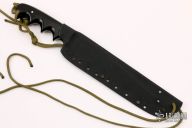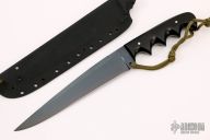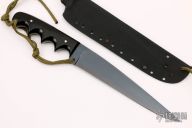 This XL Military Stiletto by Fred Perrin features a blued blade with notched thumbrest, .172" blade stock and 1.417" blade depth. The handle is comprised of black paper micarta scales with nickel silver pins over full tang construction. Includes kydex sheath. Has a few light scratches, otherwise excellent condition.