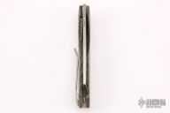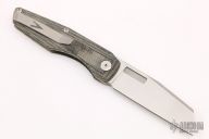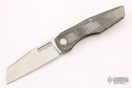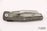 This Axon First Run Folder by Vero Engineering features a satin finished blade with notched thumbrest and thumbhole. The handle has black micarta scales with inlaid liner, tip up titanium clip with hidden screws, titanium backspacer. Rides on bearings, nice detent, lockup and blade seating. Comes with zippered case and COA #169. Has a couple marks on the blade otherwise excellent condition.