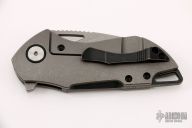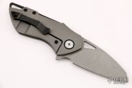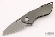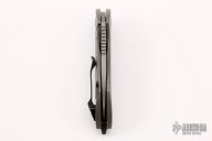This Riverstone by Grissom Knife and Tool features a dark gray stonewash finished blade with notched thumbrest and flipper. This handle has a dark gray stonewashed titanium frame, black backspacer, pocket clip, pivot collars and hardware. Stainless steel lock insert, ceramic ball bearings and detent. Stainless steel standoffs, blade stop and pivot. Comes with original box and zippered case. 05/41, excellent condition.