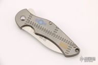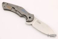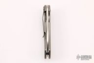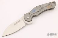 This Pro Series Junkyard framelock flipper by Tim Galyean features a stonewashed drop point blade with flipper. The handle has a milled and bead blasted titanium frame with matching titanium clip, tip down carry, and anodized titanium barrel spacers. Nice lockup, detent, and blade seating. Excellent condition. #083. Comes with a zippered case.