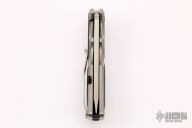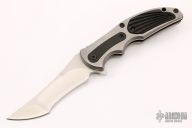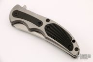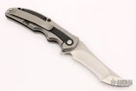 This Transfusion flipper by RJ Martin features stonewashed tanto recurve blade with notched thumbrest and flipper. The handle has a bead blast titanium frame with carbon fiber inlays, black/grey G-10 backspacer, tip up titanium clip. Fast flipper that requires no wrist action. #23 on the blade. Excellent condition. Comes with a velcro case.