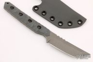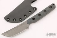 This American Samurai by Tactical Pterodactyl features an upswept tanto blade with a stonewash finish, notched thumbrest, .131" blade stock and 1.02" blade depth, full tang construction. The handle has sculpted gray g10 scales. Comes with a kydex sheath. Excellent condition.