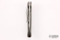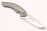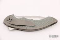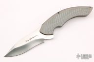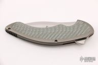 This Prototype Punk by Tim Galyean features a hand rub satin finished blade with a rounded spine and notched flipper. The handle has a bead blasted titanium frame with silver twill inlays, black G-10 backspacer with notches on the spine of the handle at the butt and thumbrest, tip down bead blasted titanium clip. Nice detent, lockup and blade seating. Comes with a velcro case. Excellent condition.