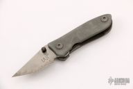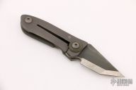 This little framelock folder by Warren Thomas features a chisel ground tanto blade with grayG-10 laminate, carbide edge and single thumbstud. The handle has a grey G-10 and bead blasted titanium frame. Nice detent, lockup and blade seating. Excellent condition.