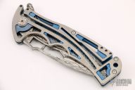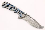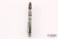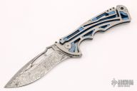 The Nirk Tighe designed by Brian Tighe and Glenn Klecker won Blade Magazine's "Most Innovative Design" award for 2010. This flipper by Brian Tighe features a milled Damasteel blade and a machined skeletonized titanium frame with anodized reliefs. tip up stainless steel clip. The knife uses Glenn Klecker's lockback mechanism - pressing the base of the spine will release the lock. Excellent condition.