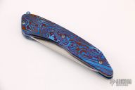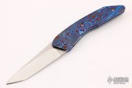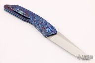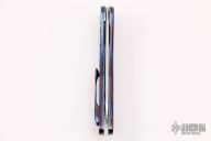 This Early Kickstop flipper by Lee Williams features a hand rub satin finished blade with textured flats, anodized titanium Kickstop flipper. The handle has a mokuti frame with a matching tip up clip, anodized titanium liners. Nice detent, lockup and blade seating. Excellent condition. Dated '11.
