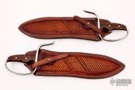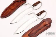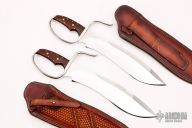 Exquisite pair of chopper style Wing Chun butterfly knives. The Sasquatch style blade is adapted from Doug Kenefick's design of the Randall Sasquatch and was blessed by Doug. The D-quard is molded AISI 304 stainless. Handle scales are gorgeous cocobolo with 8 pins to the tang plus two mosaic accent pins. Mirror polished recurve blades with false top edges, .300" blade stock and 2.446" blade depth, full tang construction. Extremely sharp, these knives have very complex grinds that really have a "WOW" factor. These come with custom premium leather sheaths with hand tooling. Excellent condition.