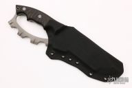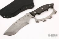 This Trench Knife from Bawidamann Blades features a stonewashed clip point blade with swedge, fileworked spine and notched thumbrest, .254" blade stock and 1.993" blade depth, full tang construction. The handle is comprised of carbon fiber scales. The "D" guard features a crenelated strike face. Lanyard hole in pommel. Includes a kydex sheath. Excellent condition.