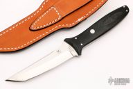 "It is only natural that Spyderco follow-up Bob Lum's folding tanto with a fixed blade, and a very classy one at that. It has a Hamaguri (appleseed) grind at the tip for added strength and the swedge on the spine lessens the overall weight. The blade has a tapered Tang, running the full length of the handle, adding overall strength. The expanded hand guard, where the blade and handle meet, makes it comfortable while gripping. Blade is hollow ground." The FB03 is a discontinued model no longer available from Spyderco. Includes original brown leather sheath. Excellent condition.