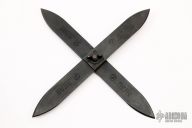 Blades tighten up solidly in both opened and folded position through the use of locking lugs on the blades to lock blades in place and a wing nut to loosen and tighten. Fast deployment from folded to ready to use. Original Cobray nylon leather tipped sheath has a loop for easy belt carry. This throwing knife was designed to be very easy to throw by anyone and the size and weight  of the knife make it very effective. Pretty much if you can throw a baseball you can throw this knife. Only the ends of the blade are sharpened. The straight part of the blade is not sharp to allow for throwing grip. The knives were made to be a utilitarian survival tool with the angle of the grind on the sharpened tips designed to allow the user to sharpen a dull tip with a simple file or similar tool in a survival situation. Excellent Condition.