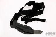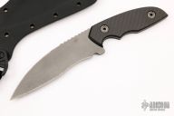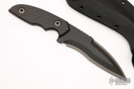 This knife by Warren Thomas features a bead blasted titanium blade with carbon fiber laminate, chisel ground recurve with carbidized edge, .171" blade stock and 1.647" blade depth, full tang construction. The handle has carbon fiber scales with blasted titanium screws. Comes with a kydex sheath with shoulder harness. Excellent condition.