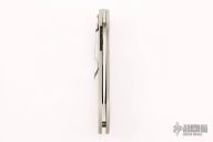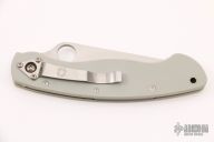 This Military Liner Lock has a satin finished blade with notched thumb rest and thumb hole. Handle is grey G10, with stainless steel single liner (lock), black fiber back spacer, black stainless steel tip down clip, and lanyard tube pin. Excellent condition. Comes with original box and papers.