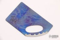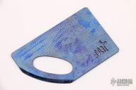 This titanium credit card knife by Warren Thomas has a sharpened corner with a carbide edge. 3 3/8" long and 2 1/8" wide. Fingerprint anodized. Excellent condition.