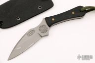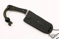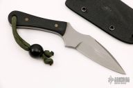 This neck knife by Larry Chew is a Laci Szabo design, it features a bead blasted blade with .181" blade stock and .799" blade depth, full tang construction with black G-10 scales. Comes with a kydex neck sheath. Has a couple light scuffs, otherwise excellent condition.