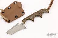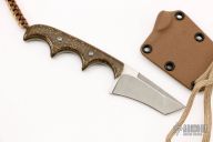 This Minimalist by Alan Folts features a two tone tanto recurve blade with .086" blade stock and .968" blade depth, full tang construction. The handle has circuit board scales, lanyard hole at the butt. Comes with a kydex sheath. Excellent condition.