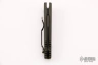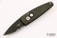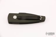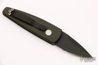 This Pro-Tech Stinger features a black partially serrated spear point blade with swedge. The handle is comprised of green anodized aluminum with tip up steel clip positioned for right hand carry. Has a couple light marks, otherwise excellent condition.