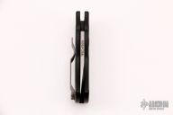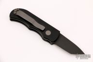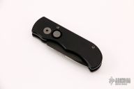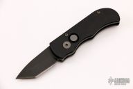 This is a Runt by Pro-Tech featuring a black aluminum handle and a black tanto blade, tip up stainless steel clip. Coil spring. California legal. Excellent condition.