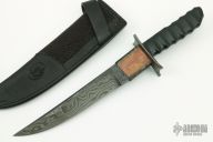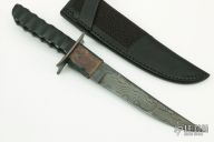 This Dagger by Mick Strider features a Damascus blade with a hammered copper habiki, .349" blade stock and 1.375" blade depth, full tang construction. The handle has a Damascus guard and a black G-10 grip. Comes with a black leather sheath. Excellent condition.