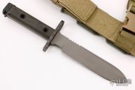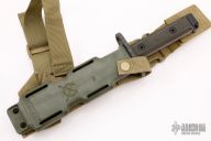 This Dwyer custom bayonet has a bead blasted blade with .248" blade thickness and 1.453" blade depth. The bayonet is functional in the hand or mounted. Made with full tang construction and green canvas micarta scales and a flamed titanium guard. The bayonet mounts on the M-16/M-4/AR-15 series of rifles. The bayonet is equipped with sheath. Excellent condition. Comes with two velcro cases, one for the knife and one for the sheath. The knife has not been inserted in the sheath, doing so will create a scuff on the blade from the retention spring.