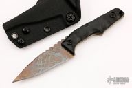 This Muninn EDC by Bawidamann Blades was named after Odin’s Raven. It features an acid etch finished blade with notched thumbrest, .101" blade stock and 1.079" blade depth, full tang construction. The handle has IM Bawidamann Chunked Pattern Carbon Fiber scales (proprietary Carbon fiber composite). Comes ready to carry with the Bawidamann Uberscabbard. New from maker.