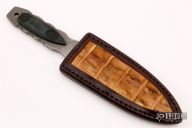 This custom dagger by Duane Dwyer features a Damascus double edged blade with .210" blade stock and 1.049" blade depth, full tang construction with black/green G-10 scales. Has some light scuffs on the blade, otherwise excellent condition. Dated 2003. Comes with a custom black leather sheath with alligator skin inlay by Kenny Rowe.