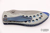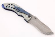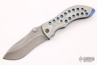 This Curr Linerlock by Neil Blackwood features a stonewashed blade with swedge, notched thumbrest and dual thumbstuds. The handle has silver twill scales, orange peel finished and anodized titanium liners, anodized titanium tip down clip, G-10 backspacer. Excellent condition.