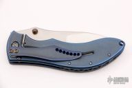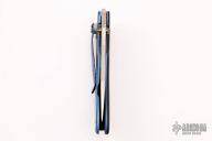 This Curr Framelock by Neil Blackwood features a hand rub satin finished blade with swedge, notched thumbrest and dual thumbstuds. The handle has a carbon fiber and  anodized titanium frame with matching tip down clip, carbon fiber backspacer. Excellent condition.
