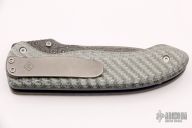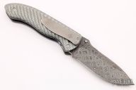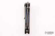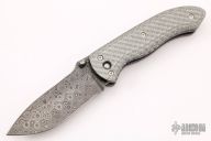 This Small Urban Combat Linerlock folder by Jim Burke features a spear point Damascus blade with a single skull thumbstud and a notched thumbrest. The handle has silver twill scales, tumbled and anodized titanium liners, tip down bead blast titanium clip. Nice lockup, and blade seating. Excellent condition.