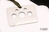 Handmade using S30V stainless steel by Peter Atwood, the Atwood Credit Card Knife is made to the same standards as all of Peter's PryBaby Tools. Measuring 3" x 2 1/8" x 1/8" and weighing only 2.2 oz, this is a very practical backup tool. The one sharpened edge measures approximately 2.25". In addition to Peter's design intent that it be a daily carry addition to one's wallet, I see it as perfect for tool boxes, tackle boxes, glove boxes, backpacks, golf bag pockets etc. Skeletonized with nylon lanyard. Satin Finish. Excellent condition. RARE. Comes with a stingray wallet sheath.