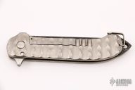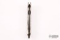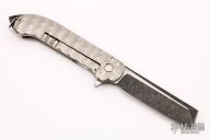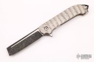 This GT Razel flipper from Jon Graham features a two-tone finished blade with flipper. The handle is comprised of an orange peeled finished titanium frame over a silver lightning strike carbon fiber backspacer with a white stripe and lanyard hole, titanium tip up clip. Nice blade seating, detent and lock up, rides on bearings. Comes with a nylon sheath. Excellent condition.