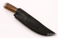 This Drop Point Hunter by Edward N Kalfayan features a mirror polished blade with .155" blade stock and .745" blade depth, hidden tang construction. The handle has a mirror polished stainless steel guard and butt, fossilized mammoth bone grip, and red and white spacers. Comes with a black leather sheath Excellent condition.