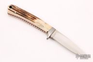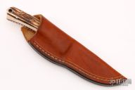 This Drop Point Hunter by Jerry Hendrix features a hand rub satin finished drop point blade, .159" blade thickness and .722" blade depth, full tapered tang construction with coin edged tang. The handle has a stainless steel guard, stag scales with red liners. Comes with a brown leather sheath. Has a few light scratches, otherwise excellent condition.