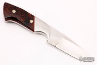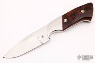 This knife by "JB" (please let us know if you know who this maker is) features a mirror polished blade with .151" blade stock and 1.288" blade depth, full tang construction. The handle has stainless steel bolsters , burl wood scales with red liners. Has some light scratches, otherwise excellent condition.