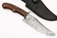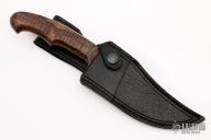 This Knife by Jan Hafinec features a clip point Damascus blade with a sharpened top edge, .223" blade stock and 1.791" blade depth, hidden tang construction. The handle has an antiqued copper guard with a nicely sculpted curly koa grip. Comes with a black leather sheath. New from maker! Extremely well done!