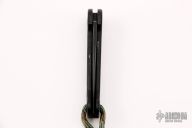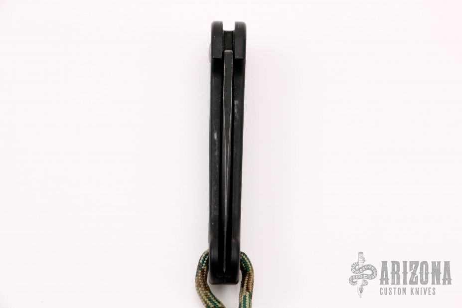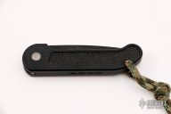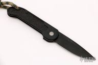 This Mini UDT has a black plain edge blade. The handle features a black aluminum frame with non-slip inserts. Light scuffs are visible on the blade and frame otherwise the knife is in excellent condition. S/N 01159. Dated 01/2014.