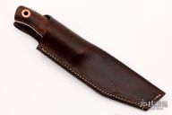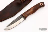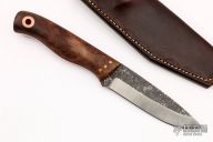 This Bushcraft by Bob Carter features a two-tone blade with .150" blade stock and 1.175" blade depth, full tang construction. The handle has Redwood Lace Burl scales with red G-10 liners and copper pins and lanyard hole at the butt. Comes with a brown leather sheath and COA. New from maker.