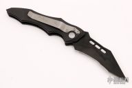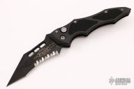 This Vector side opening automatic by Microtech Knives features a black tanto recurve blade with partial serrations. The handle has a black aluminum frame with non-slip inserts, tip down bead blasted stainless steel clip. Green standoffs. Dated 12/99 and #0406. Includes a padded zippered case.  Scuffs and scratches are visible on the blade and handle otherwise the knife is in good condition.