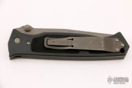 This D/A Vallotton Chameleon by Microtech is dated 4/96, numbered 565, and has the Vallotton logo on the back side of the blade. The release button for automatic opening is under the end of the clip. Has a bead blasted AEBL blade, black aluminum scales with rubber inlays, bead blasted titanium liners, tip up titanium clip. Scuffs and scratches are visible on the blade and frame otherwise the knife is in good condition.