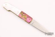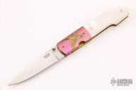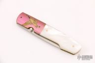 This linerlock folder by Stan Fujisaka features a hand rub satin finished blade with single thumbstud with a .10 karat SI clarity G-H color Diamond. The handle has engraved anodized titanium dovetailed bolsters, mother of pearl scales, anodized titanium liners and backspacer. Smooth action with a nice detent, lockup and blade seating. Has some light scratches, otherwise excellent condition. Comes with a zippered case and COA from the Jeweler, Steve Stanford.