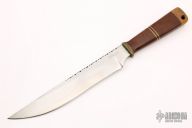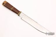 This early knife by Jody Samson features a satin finished blade with fileworked spine, .189" blade stock and 1.413" blade depth, hidden tang construction. The handle has brass guard and butt with a brown canvas micarta grip with brass spacers. Has a little patina, otherwise excellent condition.